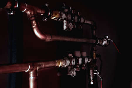 Copper pipes and valves in a dark. Close up.