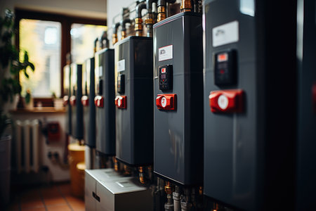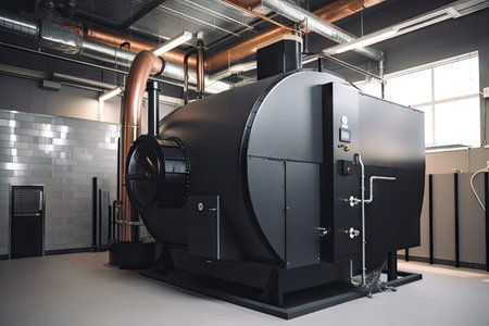 biomass boiler heating a modern office with sleek design and minimalist aesthetics, created with generative ai