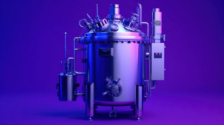 This image features a modern industrial reactor vessel with a shiny metallic surface, set against a vibrant neon purple background, ideal for science themes.