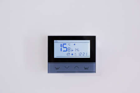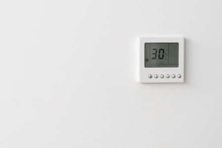 Small digital climate control thermostat with six buttons on white wall of hotel or office indicating current temperature, copy space for text