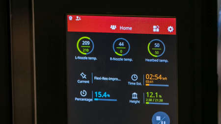 Close-up working digital 3d printer display with parameters. Nozzle temp heat temp etc.