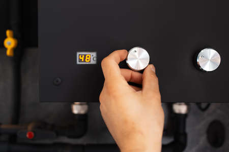 Woman hand turning regulate knob, adjusting temperature on gas or water boiler, cropped view. Female choose eco mode on heating system at kitchen or bathroom. Concept of household equipment