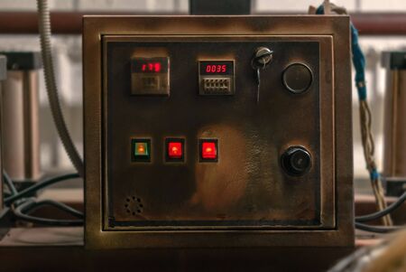 control panel of an old industrial heat press, darkened by time and high temperatures