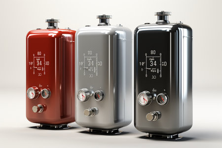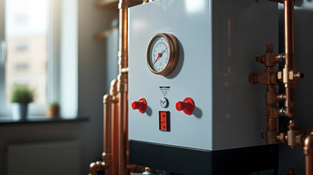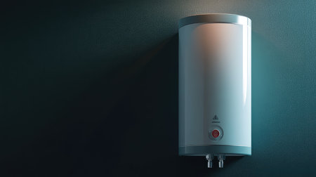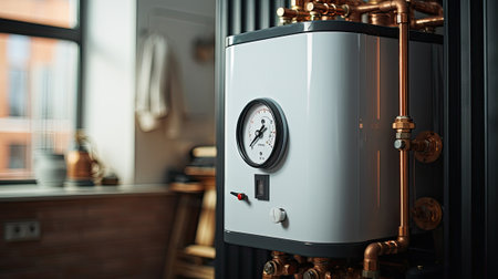A compact, stylish water heating system showcases advanced technology and streamlined pipes in a minimalist interior.