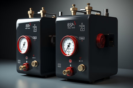 Detailed View of Air Compressor Regulator: Adjustable Knobs and Pressure Relief Valve. AI