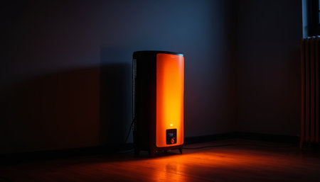 Electric heater glowing orange in a dark room, casting warm shadows on the walls