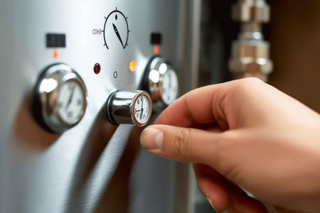 Close-up of male hand adjusting temperature on water gas heater of black.