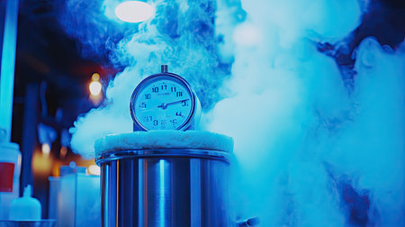 A vintage clock rests atop a metal pot enveloped in steam and blue light, creating a dynamic and atmospheric scene perfect for culinary themes.