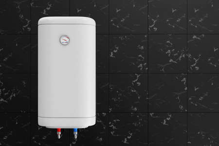 Modern water heater on black tile wall, closeup. Space for text