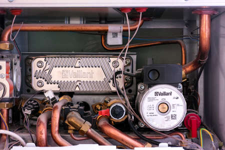 Tambov, Russian Federation - March 04, 2021 Close-up of Electronics and controls box inside of Vaillant boiler. The Vaillant Group is a company that develops products for heating, cooling and hot water