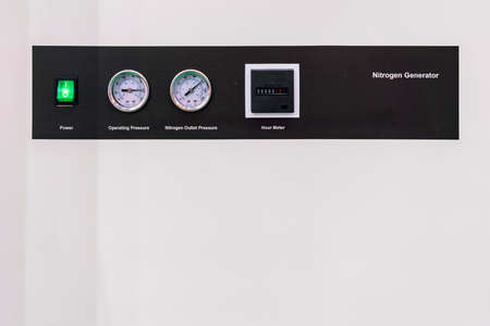 Pressure gauge - hour meter and switch electric power on off install at control panel nitrogen generator for industrial with copy space