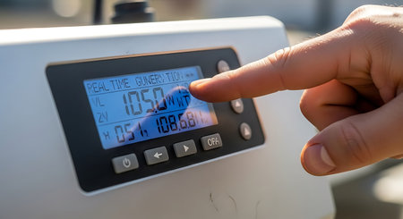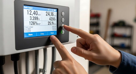 a person interacts with a digital display showing power output information on a white electronic device