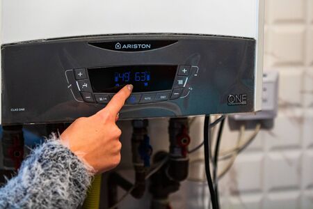 Girl hand setting temperature to heating system. Central heating control panel. Settings for temperature of heating system. Bucharest, Romania, 2020.