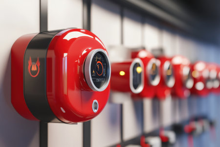 A row of striking red devices featuring digital displays is showcased, highlighting advanced technology trends.