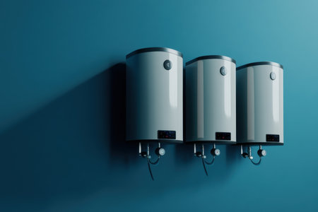 Three sleek water heaters are mounted on a stylish blue wall in a modern home environment.