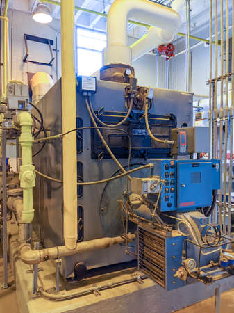 Stainless steel gas boiler in an old factory. Concept of heating.