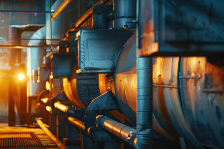Captivating view of industrial machinery within a vintage factory, showcasing steel equipment, intricate piping, and rich natural light filtering through large windows, highlighting a blend of history and engineering marvel.