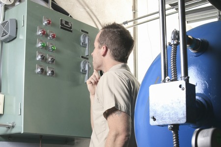 Close up of technician repairing water heater connected to heating boiler with professional lighting