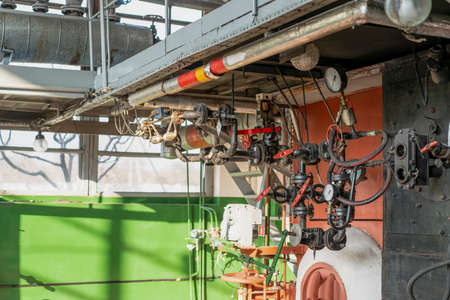 Industrial boiler sistem in boiler room in a derelict factory, HDR