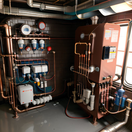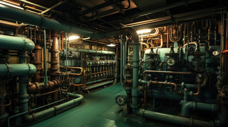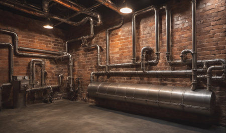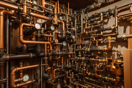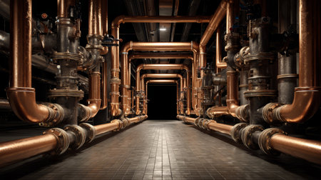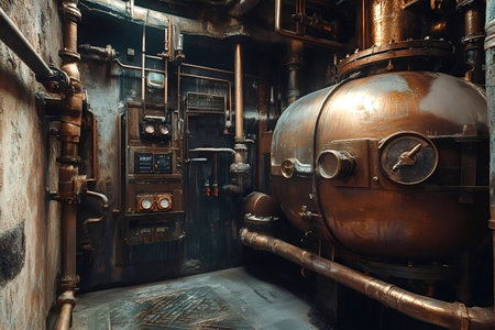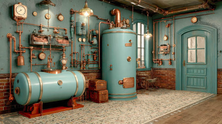 Copper tank dominates an industrial boiler room, surrounded by intricate copper pipes, pressure gauges, and control panels, evoking a steampunk atmosphere