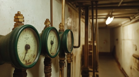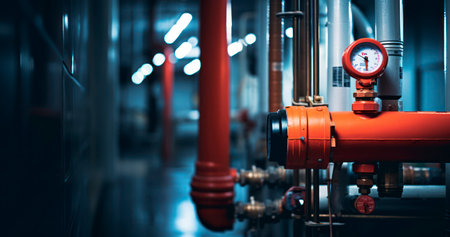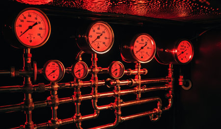 A detailed view of industrial gauges and pipes is illuminated by a warm red glow. The intricate design showcases the beauty of engineering in a mechanical environment.