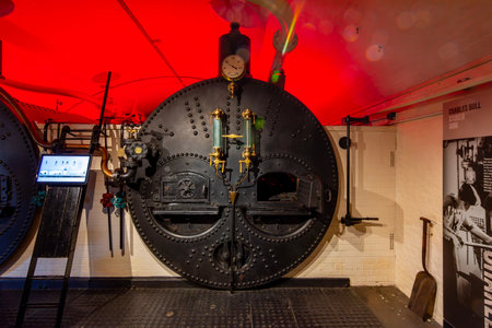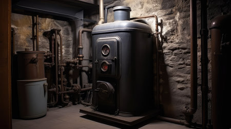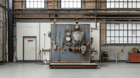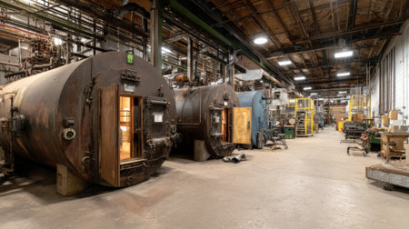 Close up of vintage steam boiler in workshop with warm light and blurred textile machinery