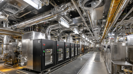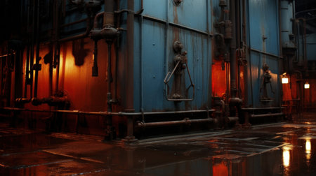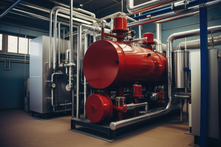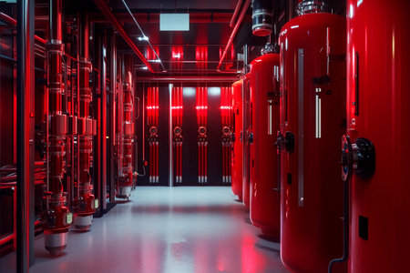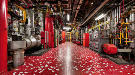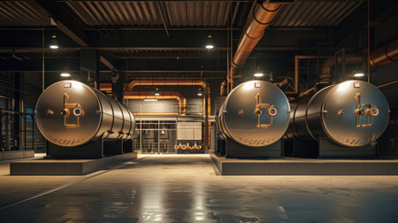Inside a modern industrial facility, large silver tanks stand tall, adorned with vivid red pipes. The scene is illuminated by a warm glow from the deep end, creating a striking visual.