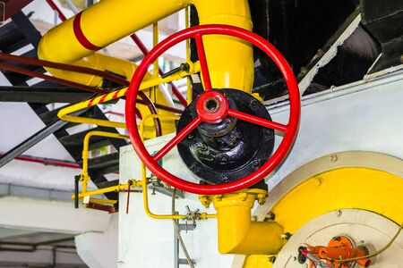 Gate valve with a red lock wheel on the technological pipeline of the power plant.