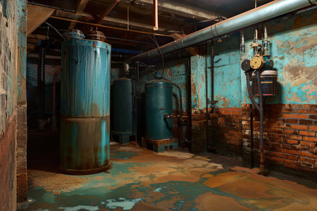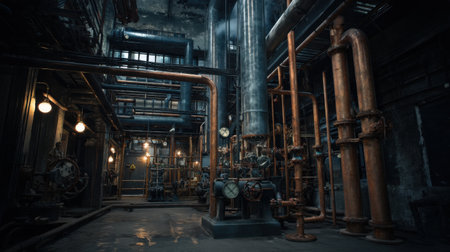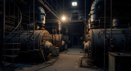 Industrial boiler sistem in boiler room in a derelict factory, HDR