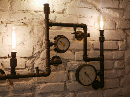 Steampunk decor. With iron pipes. and incandescent lamps. Loft style wall and steampunk pipes.