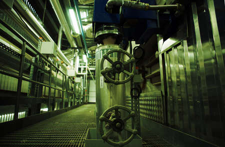 Equipment and piping inside of industrial plant. Industrial Factory. Various mechanisms and metal pipes. Toned image.
