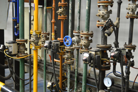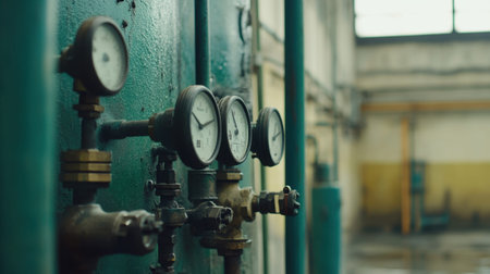 old heating system of an industrial building with many pipes and pressure gauges