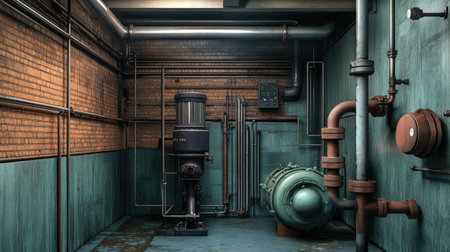 retro metal mechanism with tubes and gears in underground nuclear bomb shelter on the wall