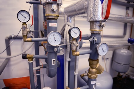 Close up of pipes, valves and manometer of heating system