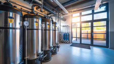 Modern Water Filtration System in Industrial Setting with Stainless Steel Tanks. Concept of Clean Water Solutions, Sustainable Technology, Efficient Infrastructure, and Innovation.