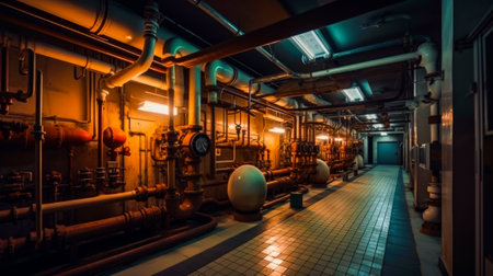 Old industrial building with pipes and pipes in the middle of the room. Generative AI.