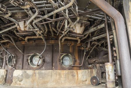 Architecture showing industrial interior with large pipes keywords: industrial, interior, factory, warehouse, pipes, ventilation, ducts, metal, steel, rust, beams, structure, architecture, abandoned, old, grunge, machinery, manufacturing, workshop, building, construction, engineering, large, scale, exposed, pipes, ceiling, windows, daylight, shadow, gritty, raw, utilitarian, vintage, retro, industrial design, factory interior, manufacturing facility, infrastructure, utility, power category:...