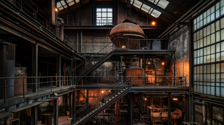 Captivating view of industrial machinery within a vintage factory, showcasing steel equipment, intricate piping, and rich natural light filtering through large windows, highlighting a blend of history and engineering marvel.