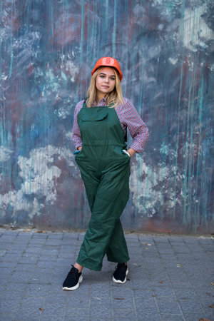 teen girl builder in protective helmet and uniform, childhood development, copy space
