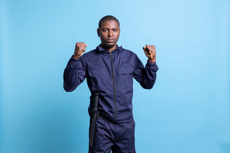 Confident security guard is clenching his fists in front of the camera, prepared for a fight in order to protect and safeguard a property. Armed agent with proper protection training.