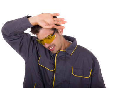 Fashionable mechanic in red Overall with cool sunglasses