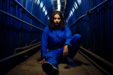 Practical Modern child underground bunker. Blue jumpsuit. Generate Ai