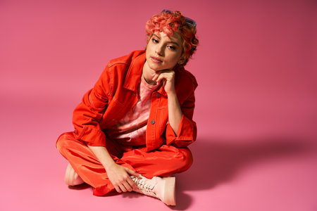 A woman with red hair in vibrant attire sits elegantly on a pink background.