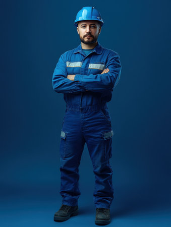 A skilled locksmith, 32 years old, stands upright in a blue uniform and helmet.
