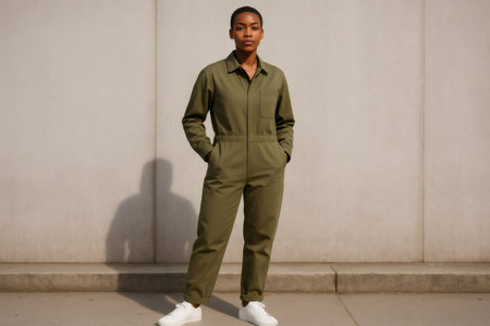 Young African American mechanic wearing stylish olive green jumpsuit and white sneakers posing near concrete wall, showing casing confidence and modern workwear