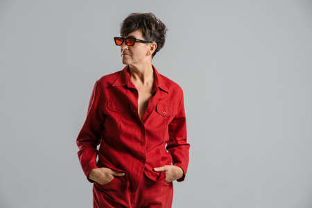 Mature european woman wearing sunglasses looking aside isolated over grey background