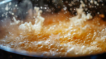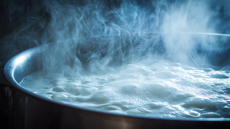 The image captures steaming milk boiling in a stainless steel pot, emphasizing the textures and movements of the bubbles, ideal for culinary themes.