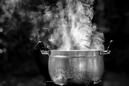 Water boils intensely in a gleaming stainless steel pot, releasing visible steam. this monochrome image conveys heat and cooking processes.