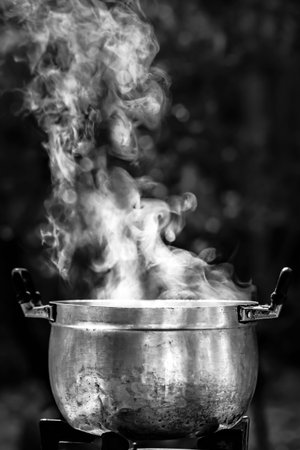 A close-up view of steam rising from a pot of boiling water, capturing the essence of cooking in a cozy kitchen environment with a dark background.