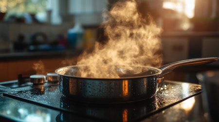 Capturing the essence of cooking, this image portrays steam rising from boiling water in a stainless steel pot, set against a warm kitchen backdrop.